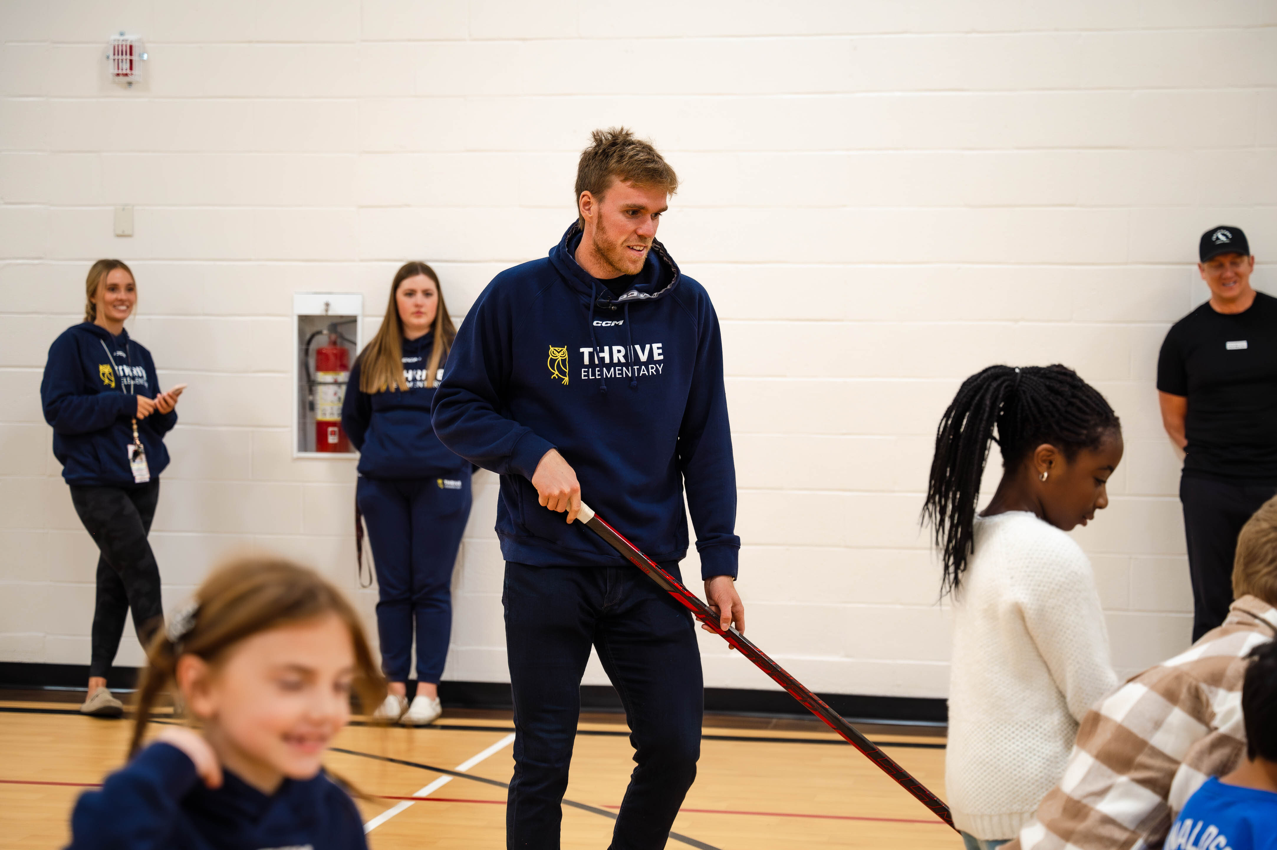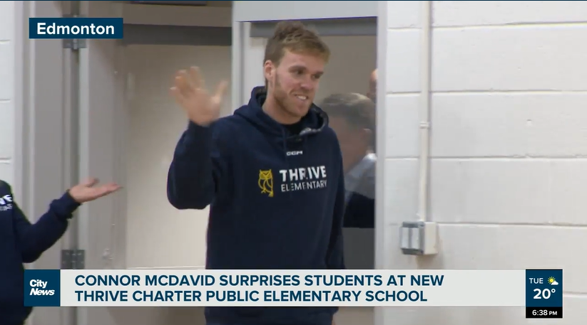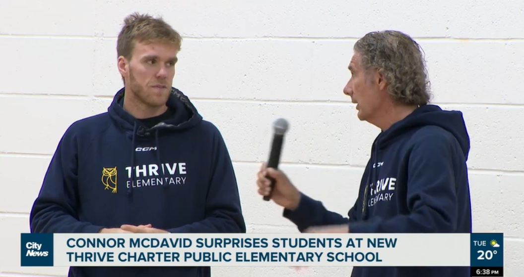 Connor McDavid makes a stop at new Thrive Elementary on September 26th, 2023, to teach students about what it takes to Thrive! He is joined by Gene Principe, host of CKEM-TV's Edmonton Oilers broadcasts.